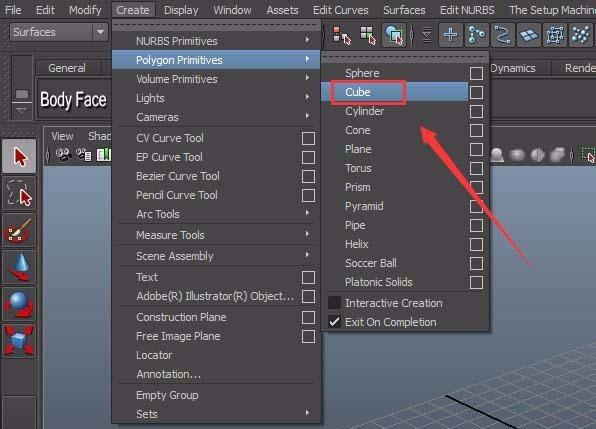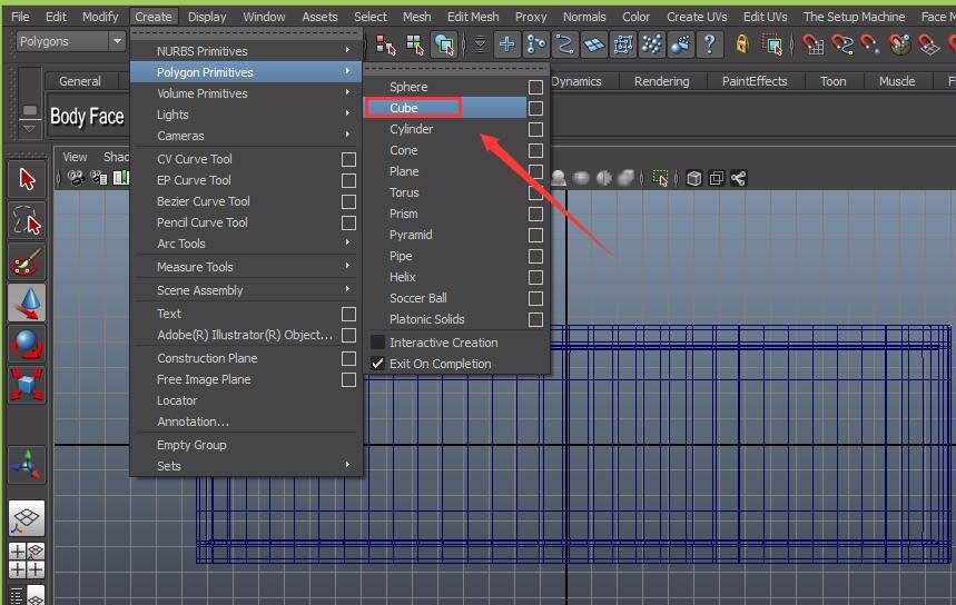 3、點(diǎn)擊create菜單,在其子級(jí)菜單里找到polygon primitives選項(xiàng),點(diǎn)擊該選項(xiàng)在其下拉菜單里找到cube命令,如圖所示: