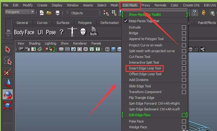 7、然后再上面的菜單里找到edit meshes菜單,點(diǎn)擊該菜單在其子級(jí)菜單里找到insert edge loop tool命令,如圖所示: