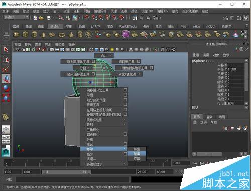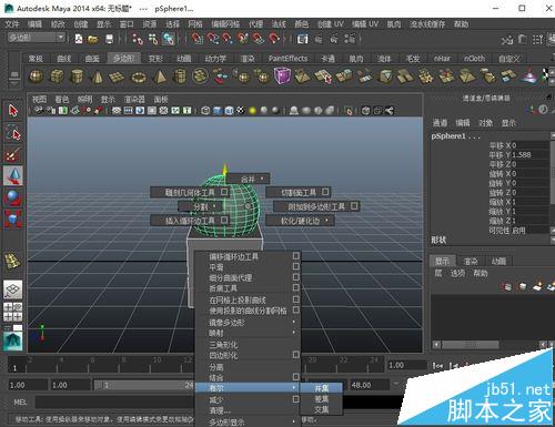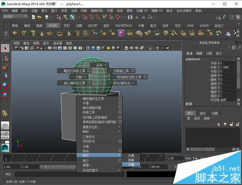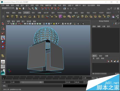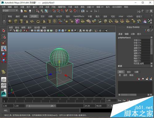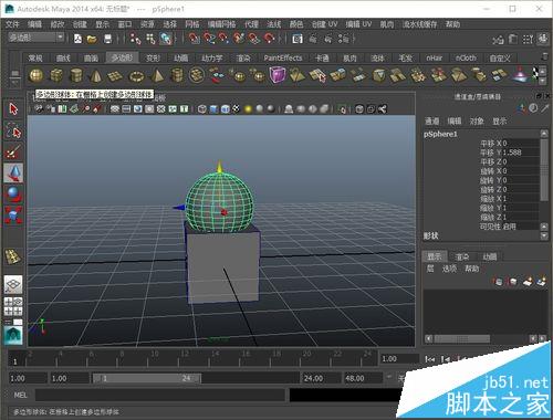 3、我們按照同樣的方法,點擊多邊形球體。然后將所建的多邊形球體模型,用移動工具拖拽到正方體的上方。不要把它們全部拖拽分離,留一部分相連接。