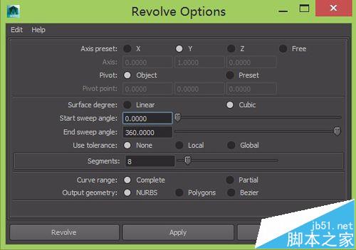10、點(diǎn)擊revolve選項(xiàng)后的方框,彈出revolve options對(duì)話框,如圖所示: