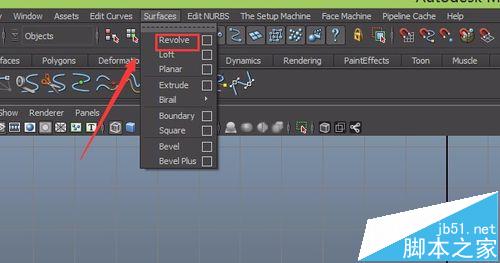 9、在surfaces菜單的下拉菜單欄里找到revolve選項(xiàng),如圖所示: