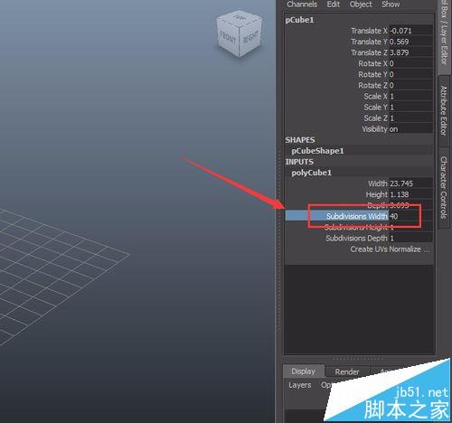 3、選擇該立方體,在channel box里調節subdivisions width的值為40,如圖所示: