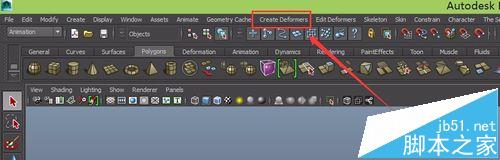 4、在上面的菜單欄里找到create deformers菜單,如圖所示: