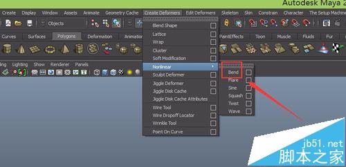 5、在create deformers下找到nonlinear選項下的bend命令,如圖所示:
