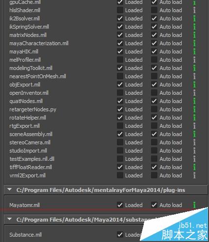 2、找到mayatomr.mll這個選項,2014版本以前的在上面顯示,2014版本的maya在下面中間顯示(不要看掉了哦)。勾選后面的loaded,Maya就會自動加載Mental ray 渲染器了。如果要每次啟動Maya,都自動加載Mental ray ,只要把后面的auto load構選上即可。