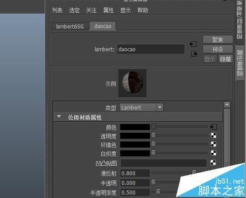 4、點擊“材質屬性”,打開材質球,可以看到“公用材質屬性”中“顏色”已經被指定了,我們在“透明度”上點擊“創建渲染節點”。