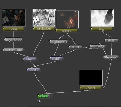 這里稍微有點難懂,我使用imult層來改變霧的密度,使用"reorder"節點,我復制圖像的r通道到alpha通道,"color"節點作為一個蒙版來使用。