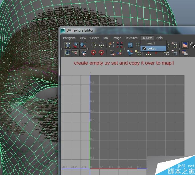 接下來我們通過繪制遮罩來控制密度,由于xGen是基于Ptex的,但是Maya的3Dpaint工具時使用UV來繪制的。這里我用了一個小竅門來得到一個新的符合Ptex的UV:創建一個新的uvSet,把他拷貝到map1,所有的uv就都消失了,然后刪除新建的這個uvSet
