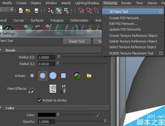 在rendering模塊中,點擊Texturing目錄下面的3DPaint Tool后面的方塊打開3DPaint工具的設置窗口