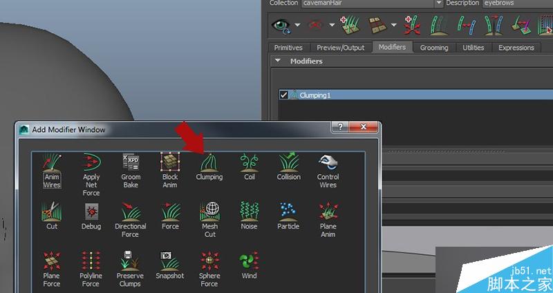 現在我們用一些修改工具來讓我們的毛發更加生動,在Modifiers面板下面創建一個Clumping修改器。