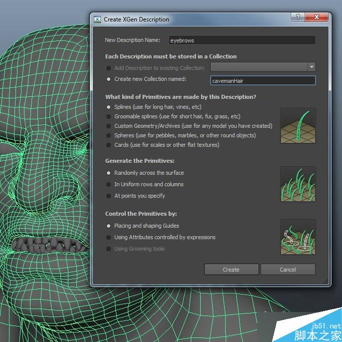 選擇要創建毛發物體創建一個新的xGen description,造型控制方式我比較喜歡用"Placing and shaping Guides"(放置和調整引導線)。