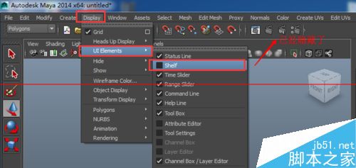 a、選擇菜單display-UI Elements-shelf前面的勾去掉就可以隱藏工具架。