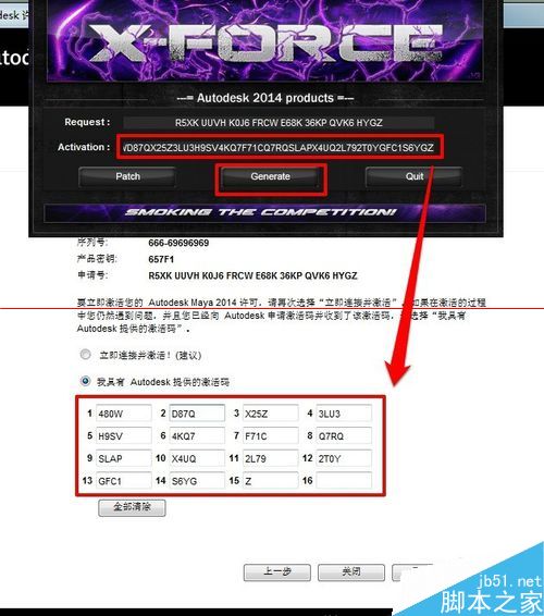 8、點擊注冊機中間的按鈕"generate",把activation框中的激活碼復制粘貼到maya2014激活碼框中,點擊下一步。