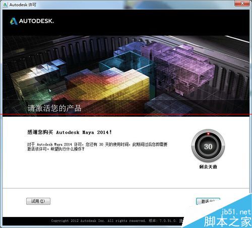maya2014屬于試用軟件,試用期為30天。試用期結束后就無法使用,必須激活后才能繼續使用。下面教大家一種免費激活的方法。由于剛安裝的軟件激活方法和已試用過軟件的激活方法有些出入,剛剛安裝的maya2014要多出幾個步驟,區別就在于第一步點擊“激活”后彈出來的對話框不同,大家可以根據自己的情況對號入座。考慮到激活步驟的全面性,本激活方法按照剛剛安裝過maya2014且從未運行過的情況來走。