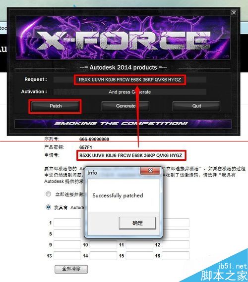 7、將maya2014激活頁界面中的申請號復制到request框中,點擊patch,并關掉成功提示框。注意:復制申請號的時候,無法使用鼠標右鍵,必須使用ctrl+c快捷鍵來復制。