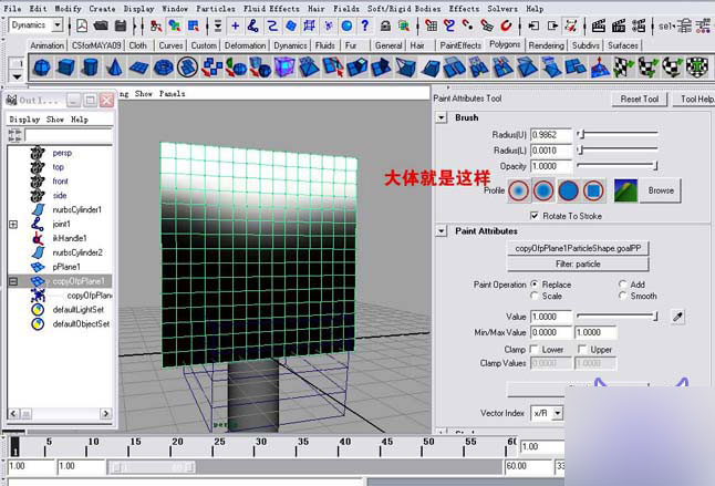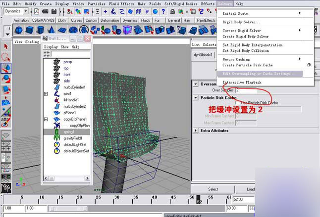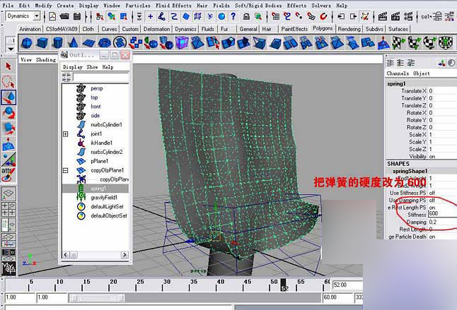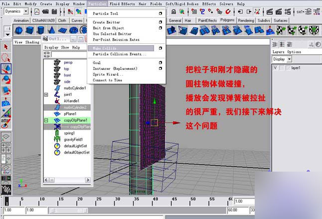 10、把粒子和剛才隱藏的圓柱物體做成碰撞,播放它會發(fā)現(xiàn)彈簧拉扯很嚴重。下面來解決這個問題。