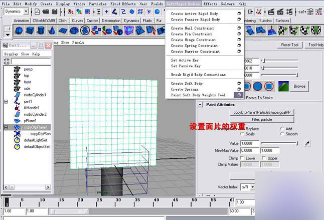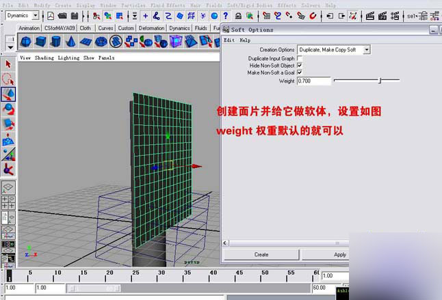 5、創(chuàng)建面片并將它做成軟體,設(shè)置如圖。weight權(quán)重默認就可以了。