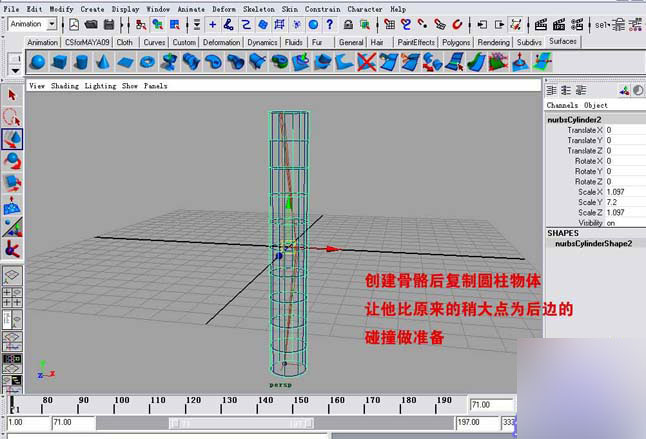 2、然后再創(chuàng)建骨骼后復制圓柱物體讓它比原來的稍大一點,以為后邊的碰撞做準備。