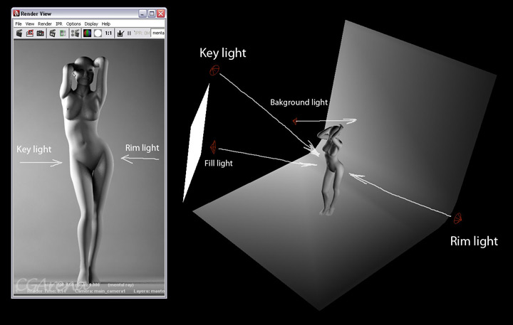 照明我選擇的是聚光燈,主要的光源照明范圍是在模型的兩邊,一個光源照亮了模型的前面,另一個光源照亮背景,這里我用的是聚光燈的二次衰減。