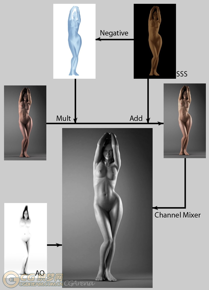 頭發—用的是MAYA中標準的毛發。我用創建的Blinn材質球作為毛發的載體。然后在PS中將渲染出來的SSS效果層和AO層組合在一起。