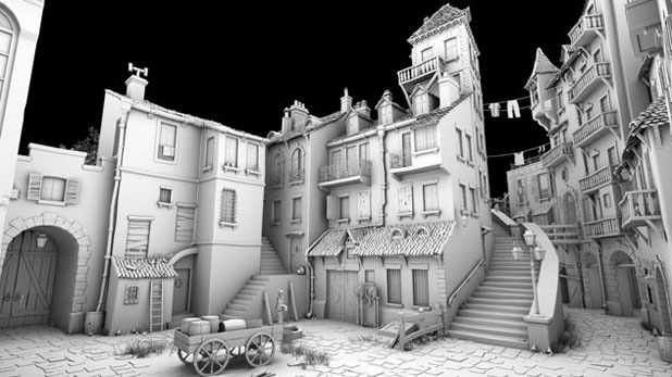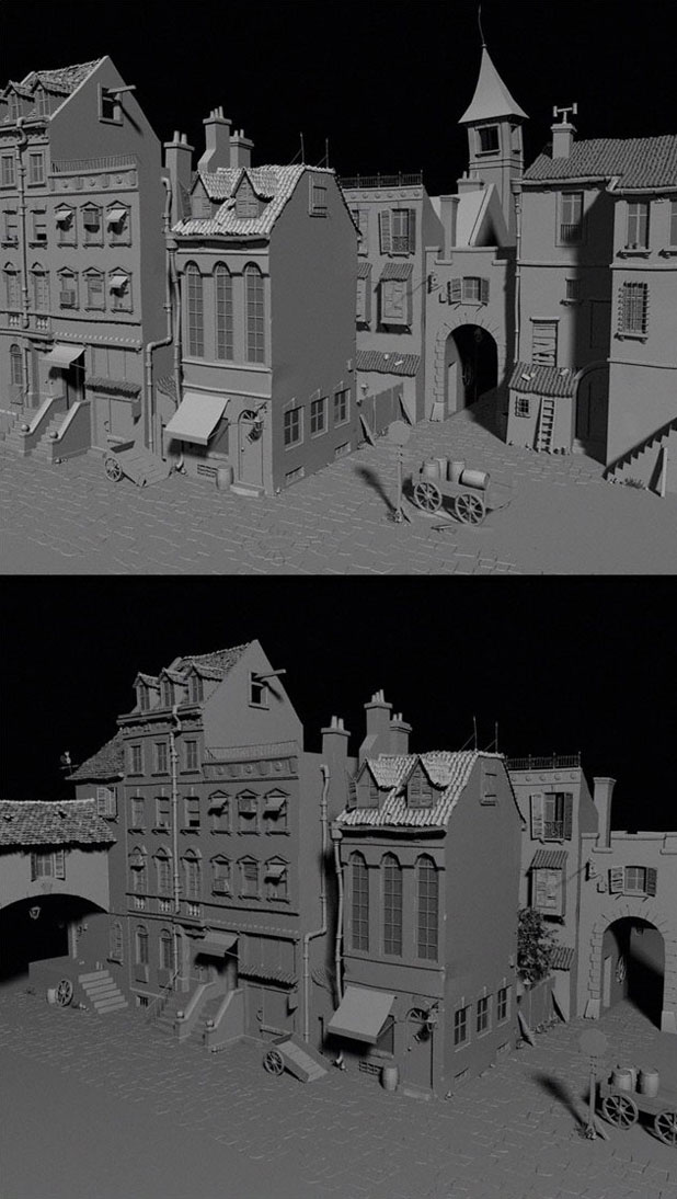圖04-05是左邊和右邊場景的粘土渲染圖,還有一些額外的細(xì)節(jié)。所有的模型都是多邊形制作的,其中很多,包括屋頂瓦片,窗戶或者煙囪都可以用來擴充場景的空間。屋頂瓦片的旋轉(zhuǎn)和位置都是隨機擺放的,但還是要謹(jǐn)慎。我甚至刪除了一些屋頂,產(chǎn)生屋頂?shù)顾男Ч?/p>