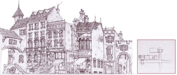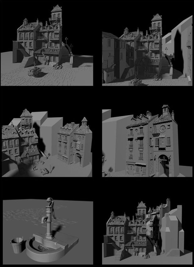 我想象著中心廣場的整體的樣子,小房子,作坊,酒吧,水渠等等。我瀏覽了很多歐洲網(wǎng)站尋找靈感,特別是法國和意大利村莊中的那些漂亮、狹窄的街道和建筑。收集了大量參考照片后,我畫了一些草圖。打算在草圖中加入很多其他的東西,設(shè)定建筑的位置和大小,街道的角度等等。
