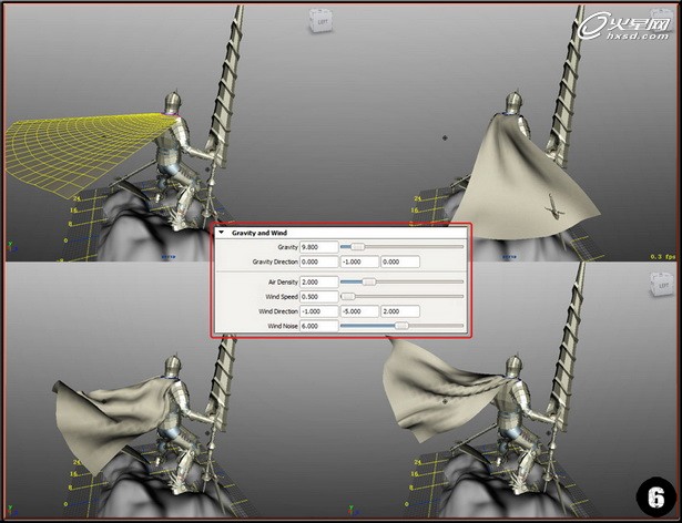 首先我在Maya中創建一個面片,然后將其創建為布料,將面片一端的點與角色頸部的模型進行點約束,然后調節基本的布料的風力大小、方向等基礎參數;經過多次解算后得到自己想要的披風的大型的樣子;這樣做是為了能夠得到更加自然真實的披風形態。(如圖06)