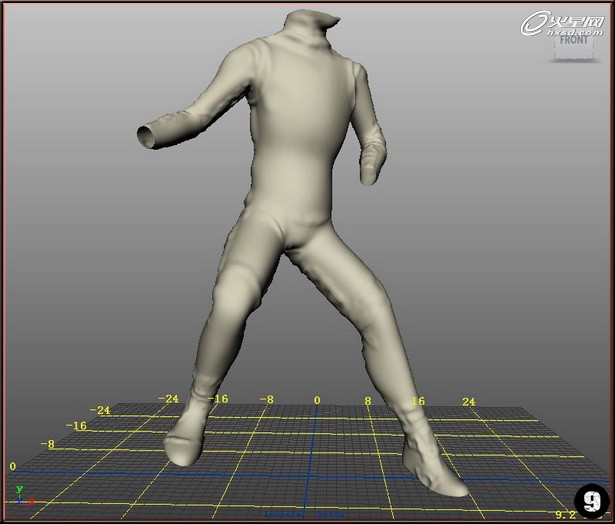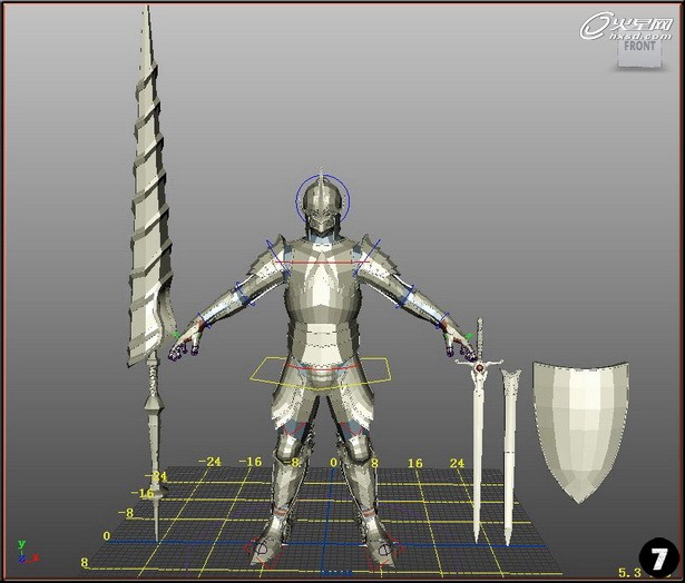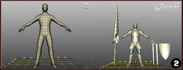 這個角色,全身都被鏈甲以及盔甲所覆蓋;看不見任何裸露的皮膚。首先要確定角色模型大的比例結構,這里我在Maya中導入一個Silo自帶的人體基礎模型作為參考,作為后面整體裝備制作的大型參照。(如圖02)