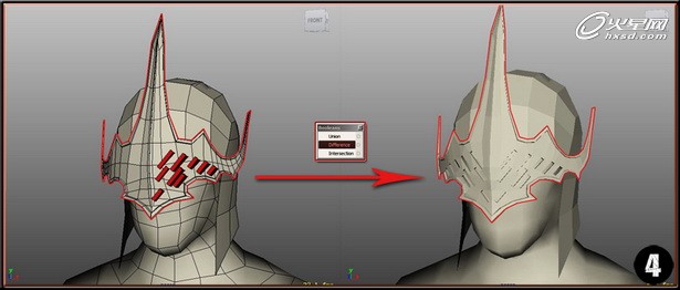 頭盔面部配飾上的小孔我是用Booleans命令來進行制作的。首先制作好頭盔面部的配飾,然后用創建Cube擺放到我想要進行開孔的位置;然后執行Difference命令,這樣得到的孔,就能很好的保留配飾原有表面的曲度。(如圖4)