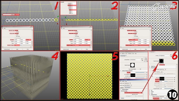 然后將得到的圓環打組復制一組,將復制出來的一組,改數值Scale X為-1,Translate X為0.5,Translate Z為1,得到(如圖10:2)效果;將得到的2組圓環整體一起打組,在執行Duplicate Special Options,設置Translate X 為2,Number of Special為16,得到(如圖10:3)效果。