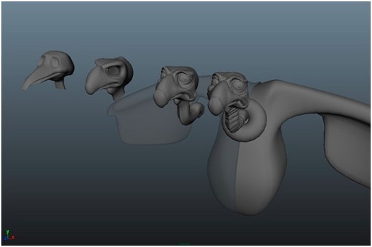 然后,我測試了幾個面部表情,找到合適的。設計上完成后,我開始循環遵循解剖鳥組建網格創建邊(圖04)。做網格時,我總是喜歡建模型的網格,就好像它是動畫,它始終是一個很好的鍛煉。