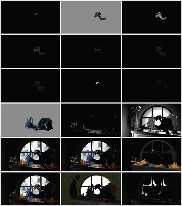 我用了一個點光轉換成主區域燈光來作為現場的窗口的主燈,和許多射燈來照亮其他的點。直接照明的使用,使我們能夠更快的渲染,僅僅幾分鐘。我喜歡在許多渲染層渲染,這樣我在合成的時候可以更好的控制。我將我的渲染層分為6個不同的部分:背景,衣服,禿鷲,羽毛,書桌和其他。每個渲染層分為8 – 10個渲染燈共約70-80渲染層(圖08),渲染通道。