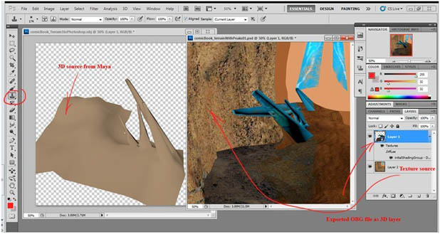 現(xiàn)在這個女孩看上去像從一個科幻小說電影里面裁出來的一樣。下一個步驟是環(huán)境。首先我在瑪雅中使用擠壓多邊形做出地面和一些水晶。然后在PS中修改,使用了一個3 D層。我只是把紋理拖到圖層的底層(紋理原始素材),然后用圖章工具來修改水晶的材質(zhì) (圖13).