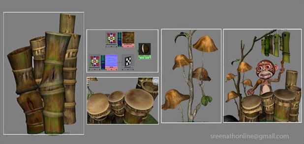 用一個圓柱體或者四邊形創建竹子,鼓,蘑菇等等(圖03)。