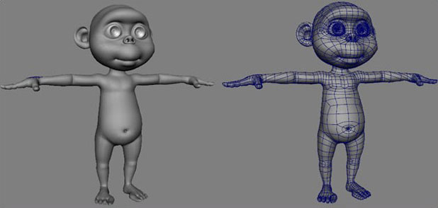 大部分過程都是用的Maya,只是用Photoshop做了紋理和合成。猴子這個角色和所有的道具是用四邊形建模原理制作的。在建立角色模型的時候我用了擠壓,分割多邊形,插入邊緣循環等(圖02)。