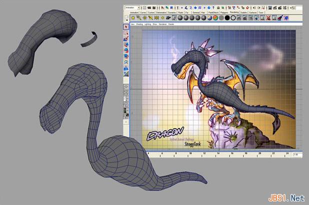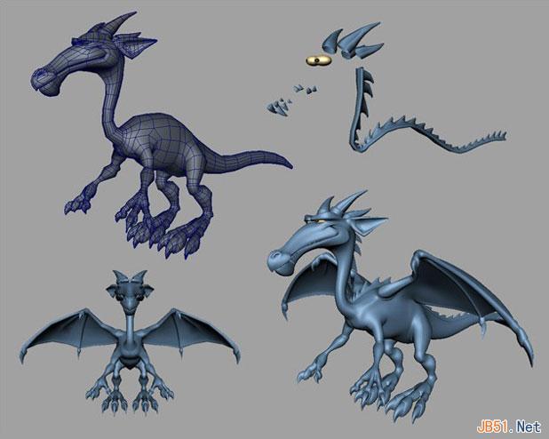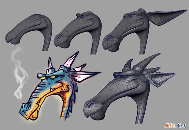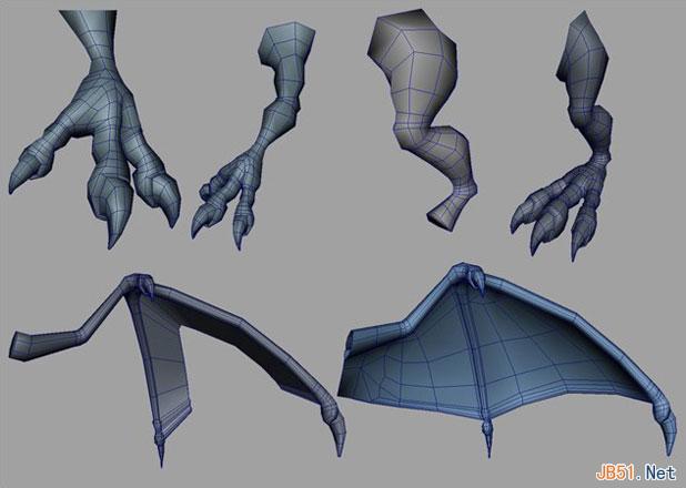 棘手的問(wèn)題是稍后要把3D模型與概念細(xì)節(jié),比如微笑和眼睛匹配起來(lái)。如果一開(kāi)始滿意概念的話,我總是會(huì)嘗試保留一定的特點(diǎn),比如表情,氛圍和角色(圖03)。我用同樣的技術(shù)創(chuàng)建了手和腳的模型,然后添加到身體上。翅膀的建模因?yàn)楹穸鹊脑敢庥幸稽c(diǎn)困難。要把所有的幾何體保持在四邊形的狀態(tài)有一點(diǎn)棘手。龍角、爪子和背后的刺是作為獨(dú)立的部分建模的(圖04和05)。