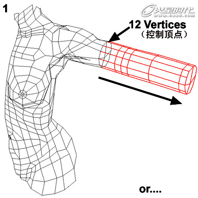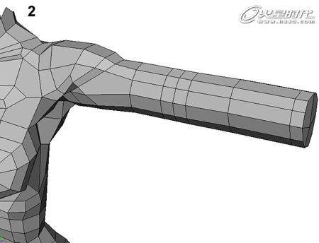 首先可以通過擠壓(Extrude)的方法從身體模型上的邊界機型擠壓來制作手臂的大致輪廓,如下圖。(圖01)
