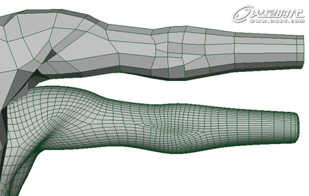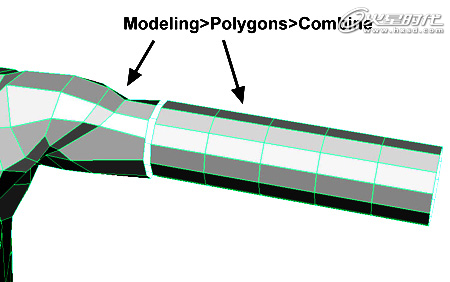 將圓柱體兩邊的多邊形面片刪除掉,然后選擇身體模型和這個圓柱體模型,切換到Modeling模塊,執行菜單命令Polygons->Conbine,將它們結合為一個整體,如下圖。(圖03)
