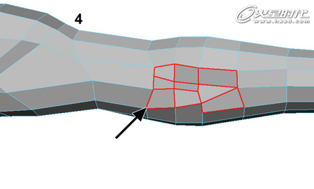 同樣使用切割多邊形命令,按照圖中紅色線條的位置進行切割,制作出手臂外側肘根部的拓撲結構,如下圖。(圖08)