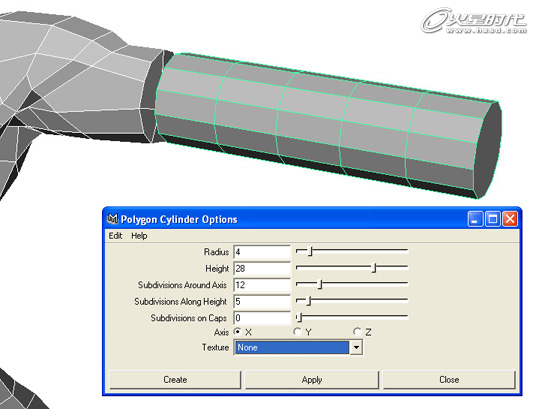也可通過創建一個圓柱體來制作手臂模型。創建一個圓柱體,注意這里一定要保證圓柱體上有12個控制點,這個圓柱體可以直接使用創建圓柱體命令,并參照圖中的設置。(圖02)