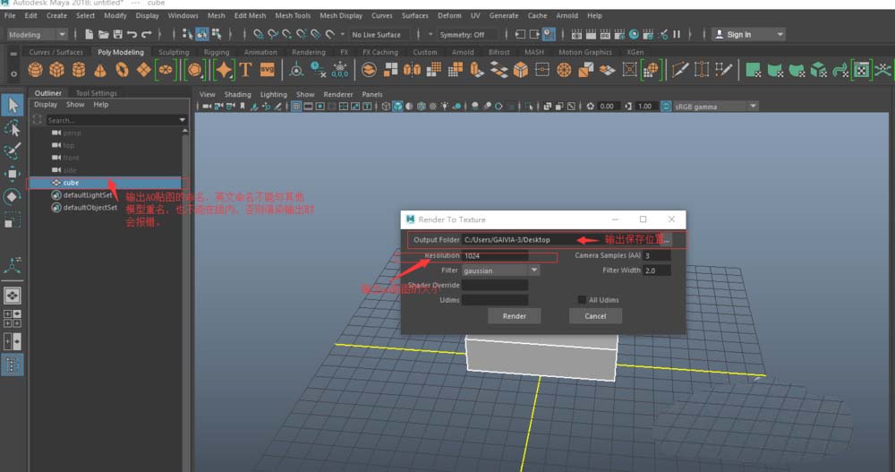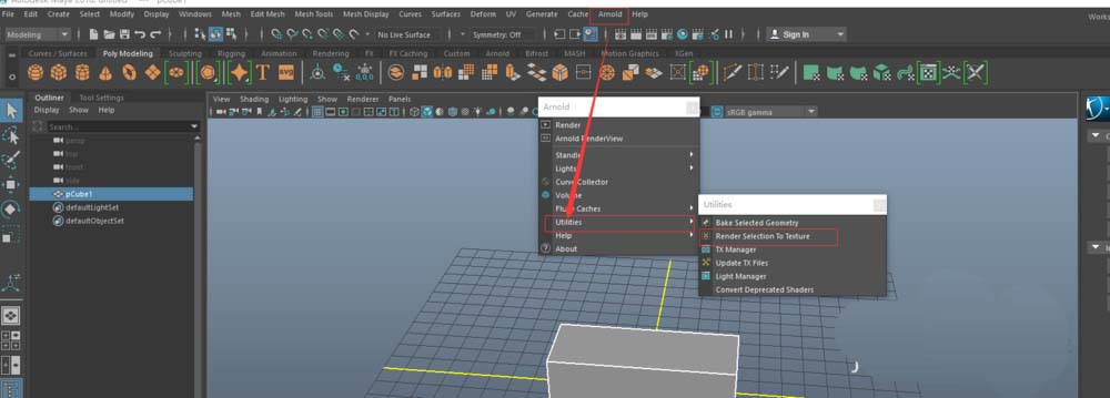3、接下來就是要渲染了,選擇Arnold__Utilities__Render Selection To Texture。在彈出框里選擇保存位置和貼圖的大小。注意這里沒有貼圖的命名,貼圖名字為大綱視圖中模型的命名。且命名不能與其他模型重復且不能在組內。點擊選擇彈出框的Render按鈕開始渲染。默認格式.exr。