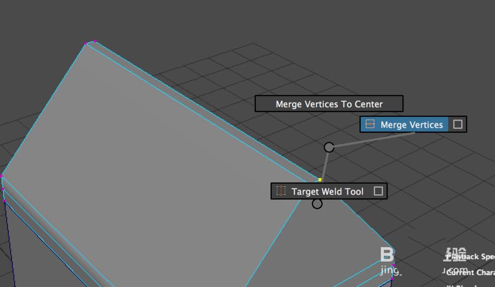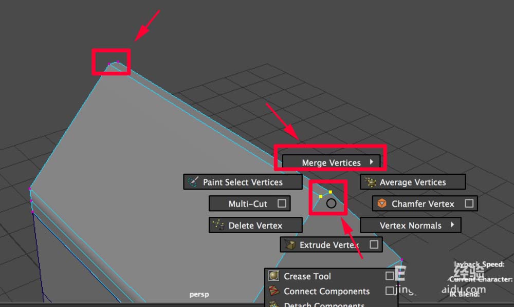 7、在屋頂上按鼠標右鍵切換到“頂點”【Vertex】,選擇屋頂上靠近的兩個頂點,Shift+鼠標右鍵選擇【Merge Vertices-Merge Vertices】,對相鄰的兩個頂點進行合并。