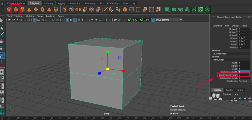 1、打開Maya軟件,創建一個多邊形立方體,在右側通道盒修改高度細分為2。并通過縮放工具【R鍵】,將長和寬拉伸至合適的尺寸。