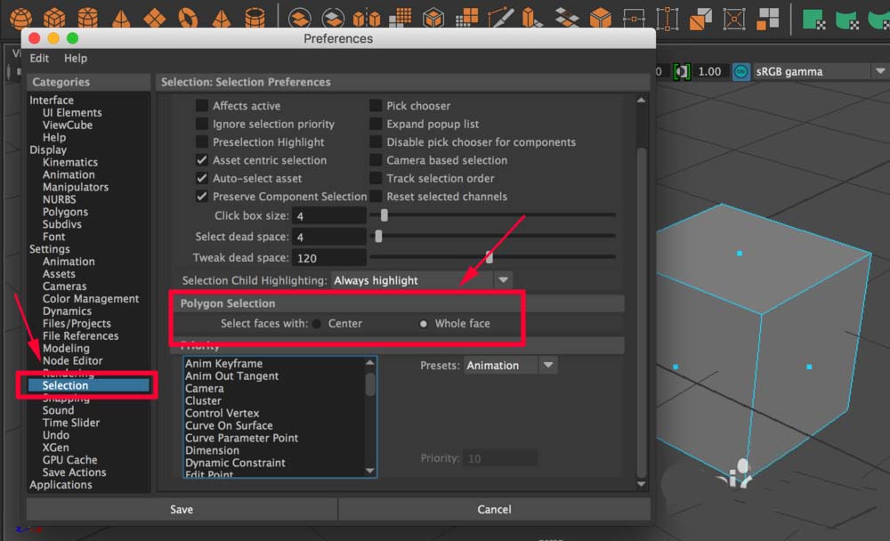 6、在打開的對(duì)話框里找到“選擇”【Settings-Selections】,在右側(cè)“多邊形選擇”下將“面的選擇方式”改為“整面”,點(diǎn)擊下方的【Save】保存一下設(shè)置。
