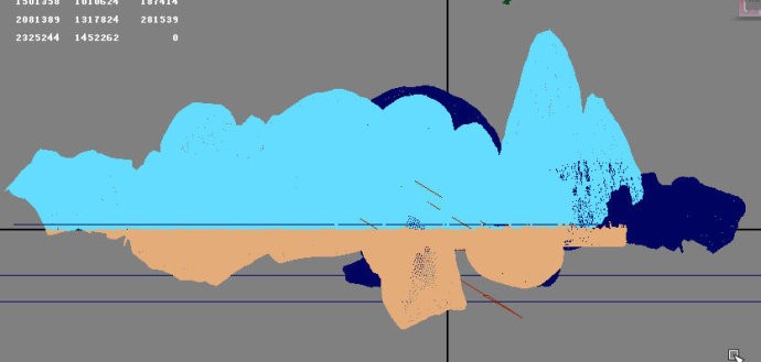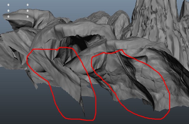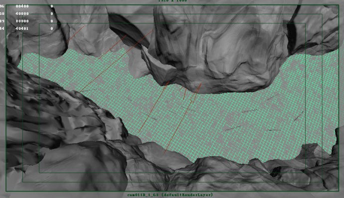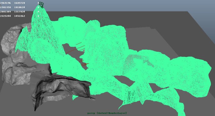 1、觀察鏡頭中的群山范圍。確定哪些山體需要植樹。去掉不需要的隱藏面,這些位置是不需要植樹的。