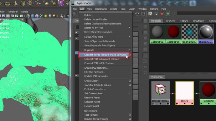9、選擇模型和雪snow材質的shader,執行貼圖轉換命令。