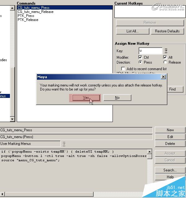 第11步、在彈出的對話框中單擊Yes,這將確保我們的標記菜單將正確的使用。