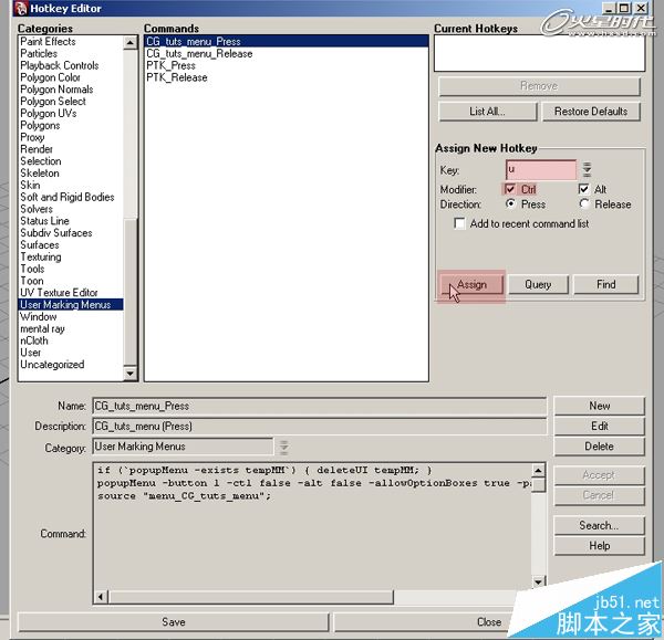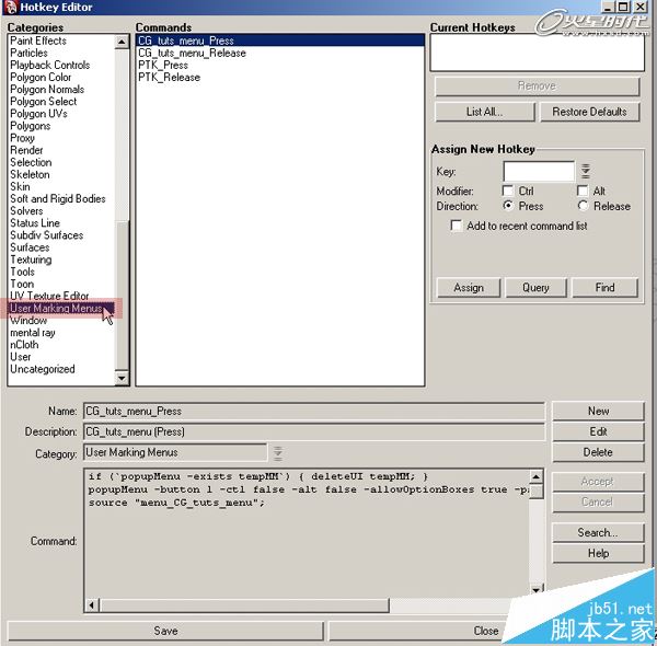 第9步、從左側類別列表中選擇User Marking Menus,然后選擇右邊剛剛做好的自定義標記菜單。