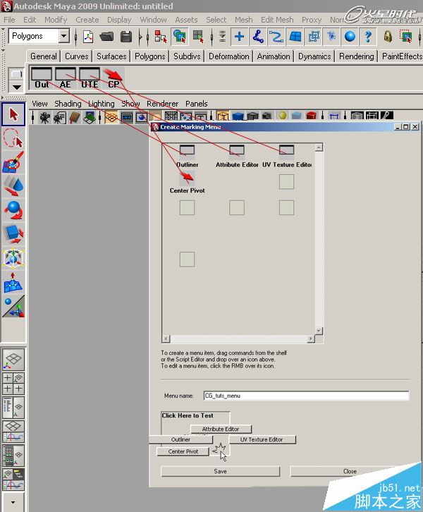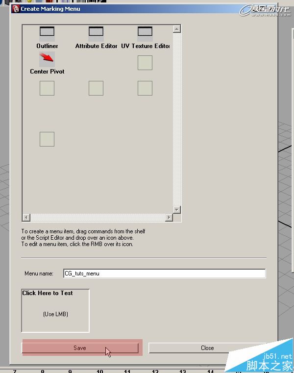 第5步、現在,將每個快捷欄里的命令拖動到創建標記菜單窗口的槽內。然后將Menu name命名。