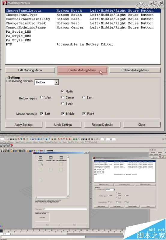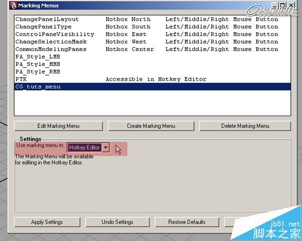 第7步、我希望能夠有一個熱鍵來調用我們的新菜單,選擇Use marking menu從下拉菜單選擇Hotkey Editor?,F在,點擊應用設置并關閉窗口。我的菜單現已完成,只需要一個使用它的方式!